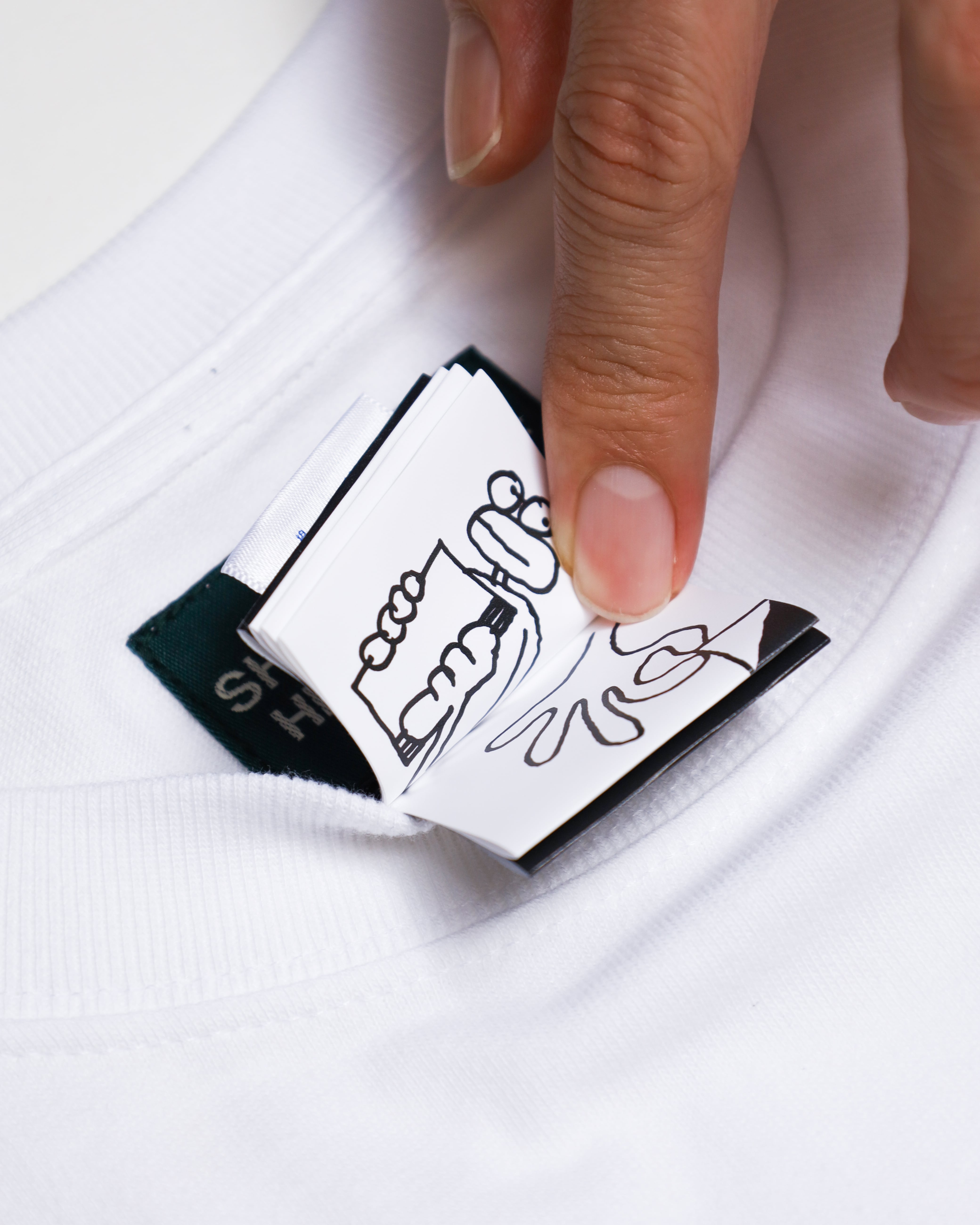 今回はフランス出身アーティスト、コンタンにブランドロゴとSSHBOOKS君を描いて頂きました。首タグの部分にはコンタンが描いた”ZINE”付きです。